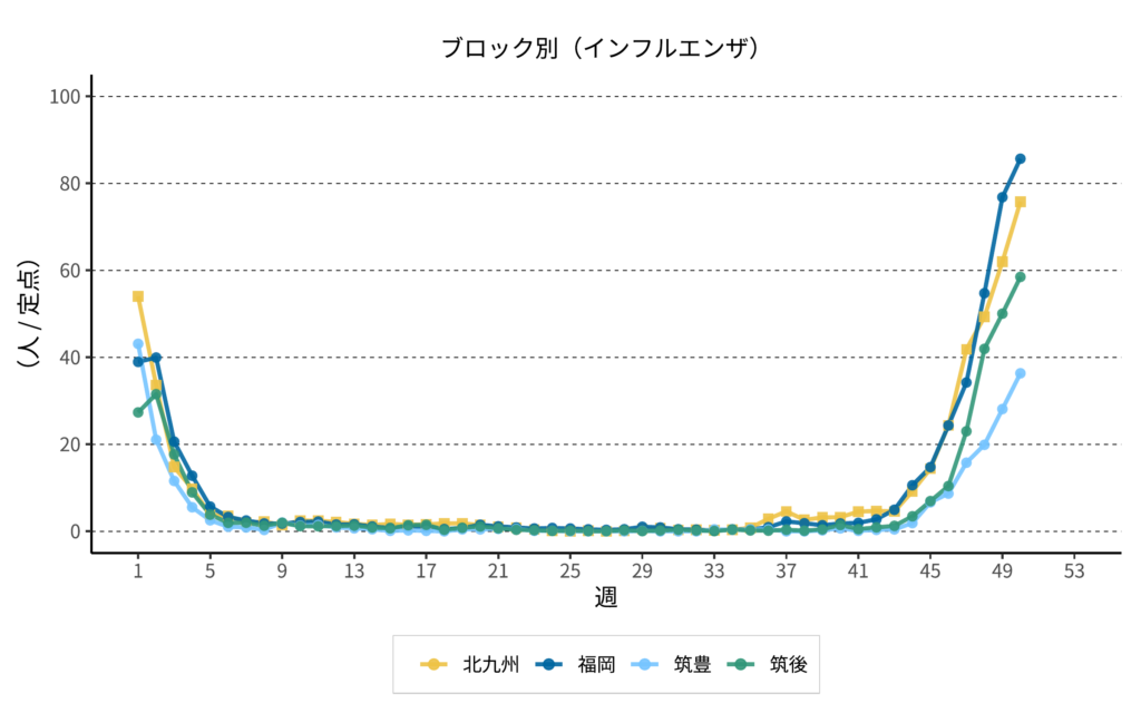 インフルエンザが依然として猛威を振るっています。筑後地方でも定点あたり60人に迫る勢いです。